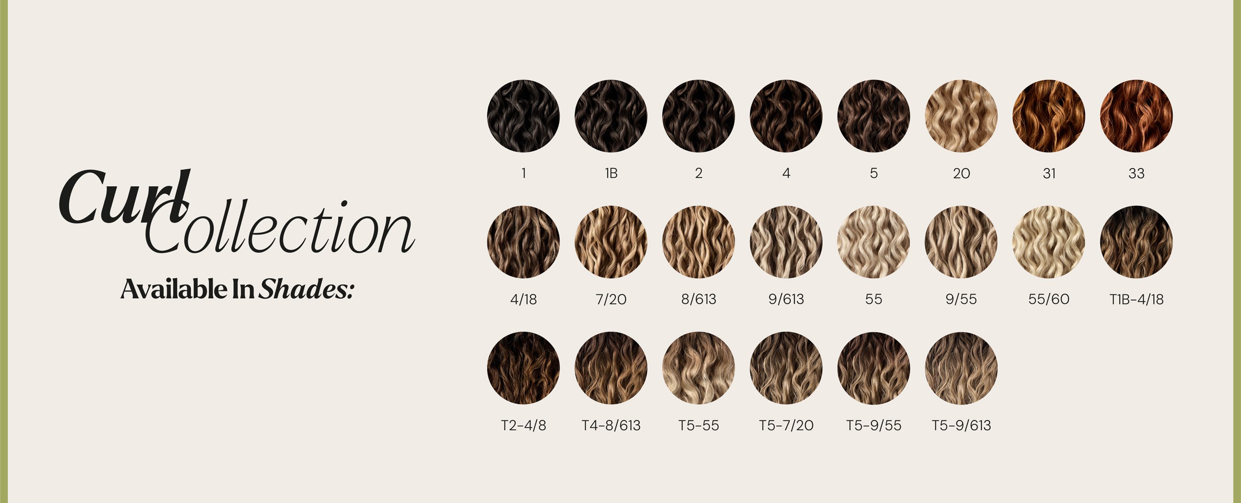 All of the 22 colours available in the Curl Collection Weft are available on our Elegance and Deluxe colour ring.