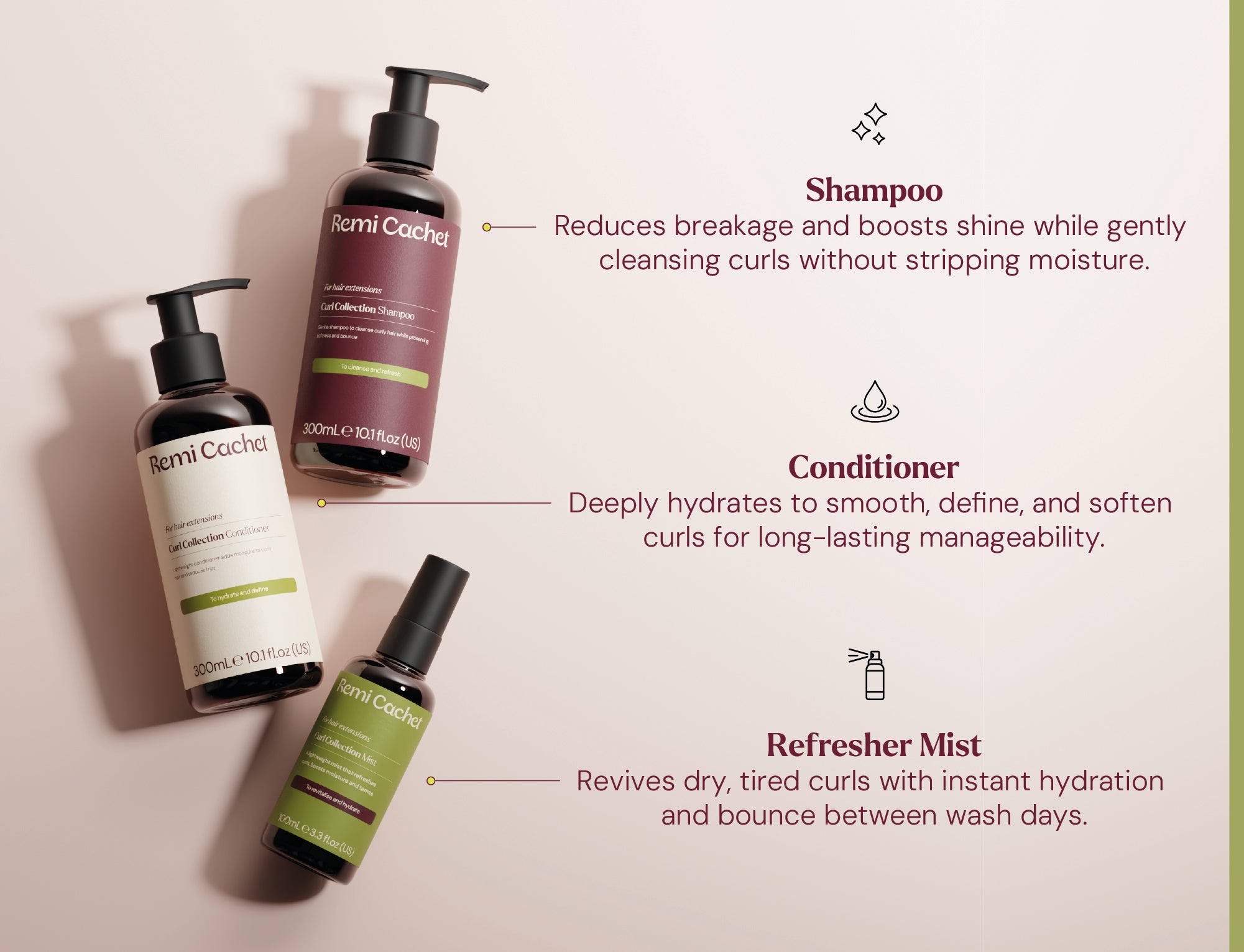 We recommend using our Remi Cachet Curl Shampoo, Conditioner, Miracle Mist and Hair Oil which are all created specifically for Curl extensions to maintain hair and scalp health, and extend the life of your extensions.