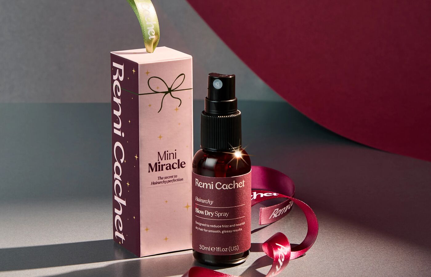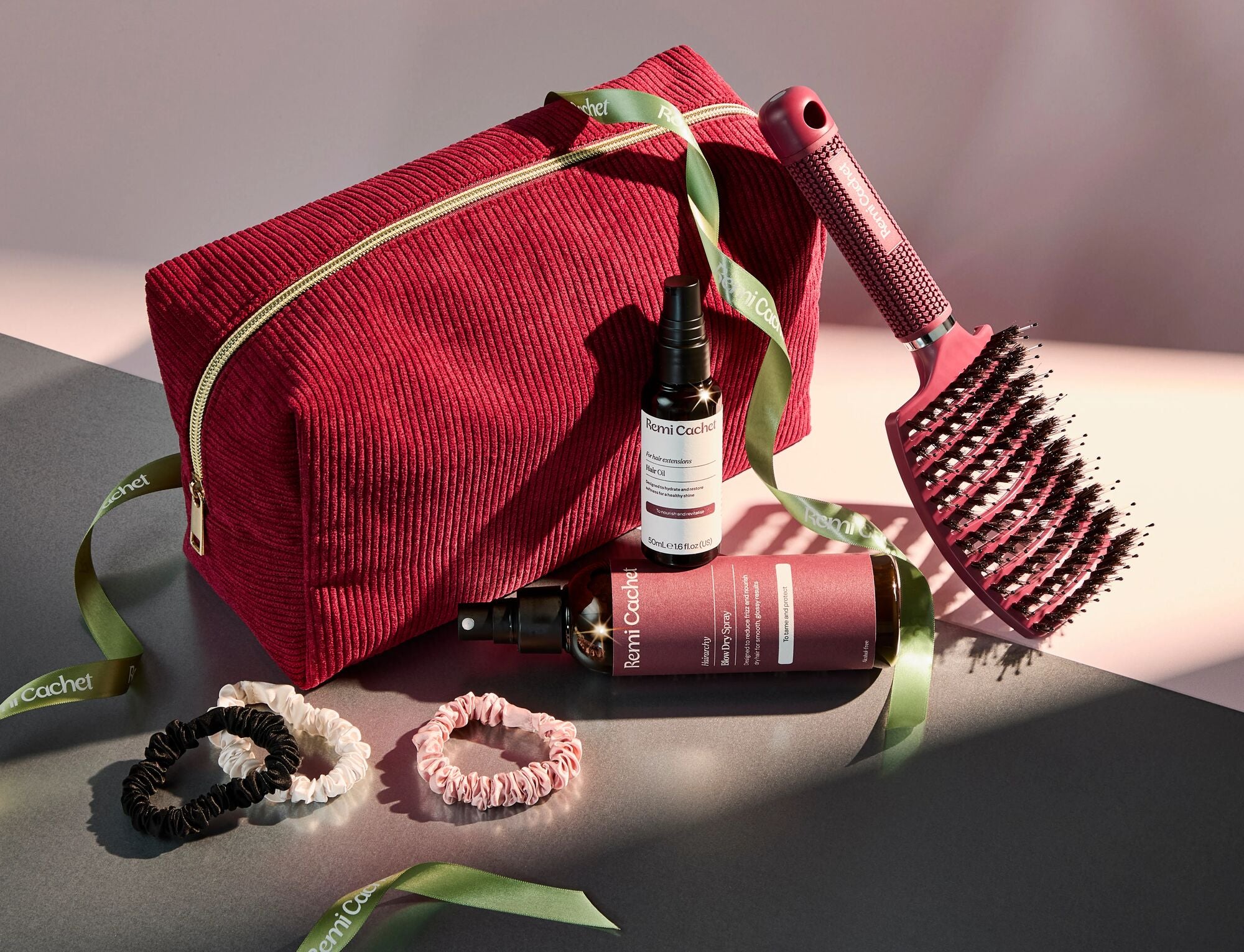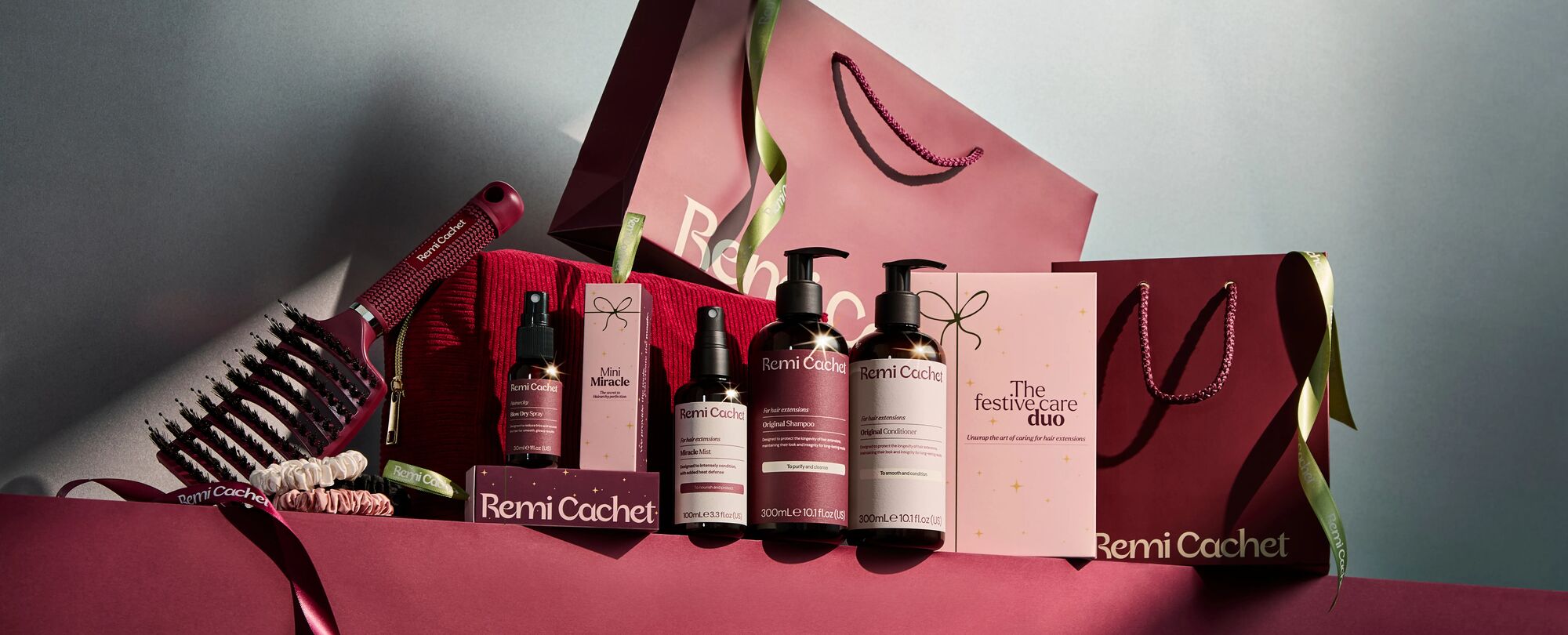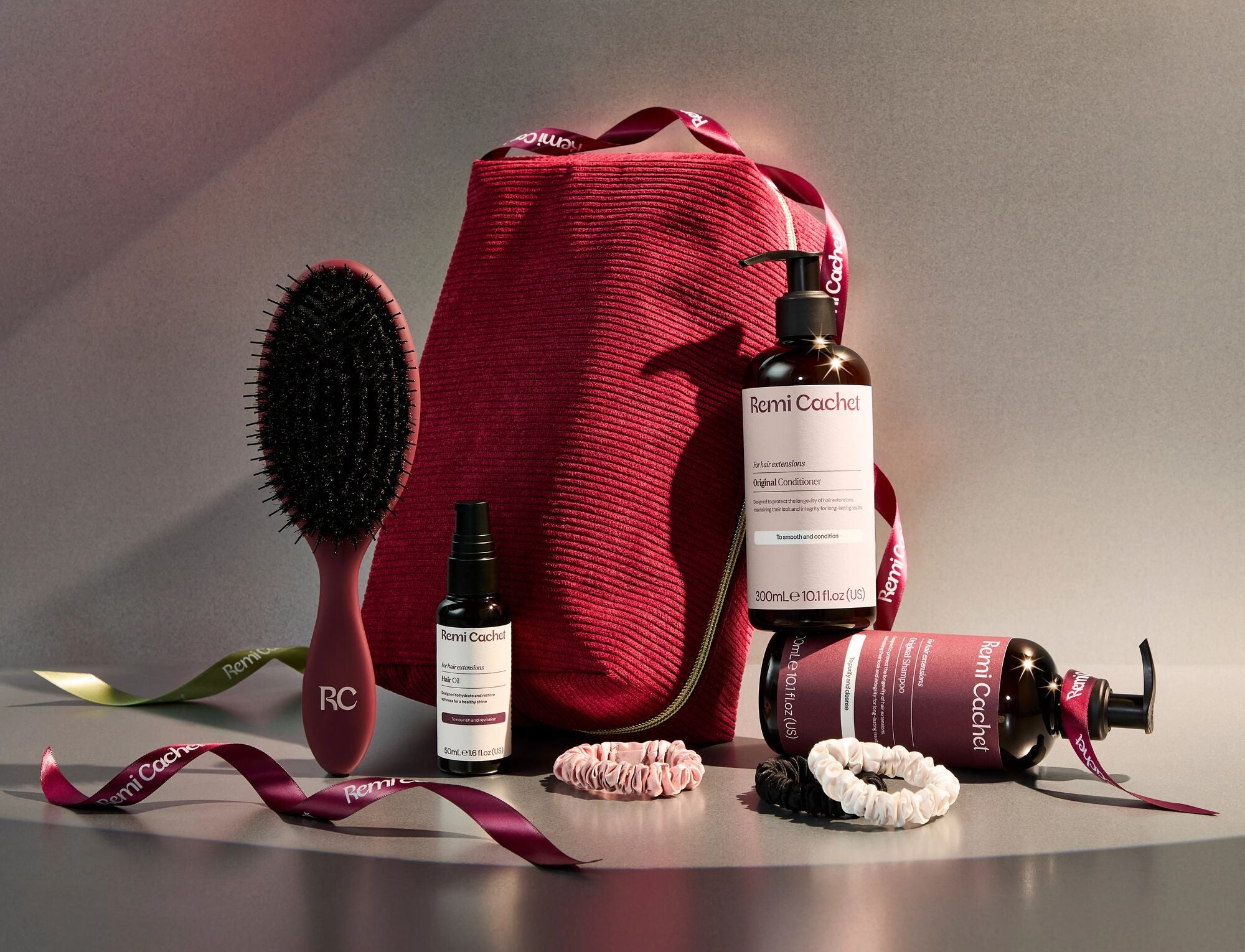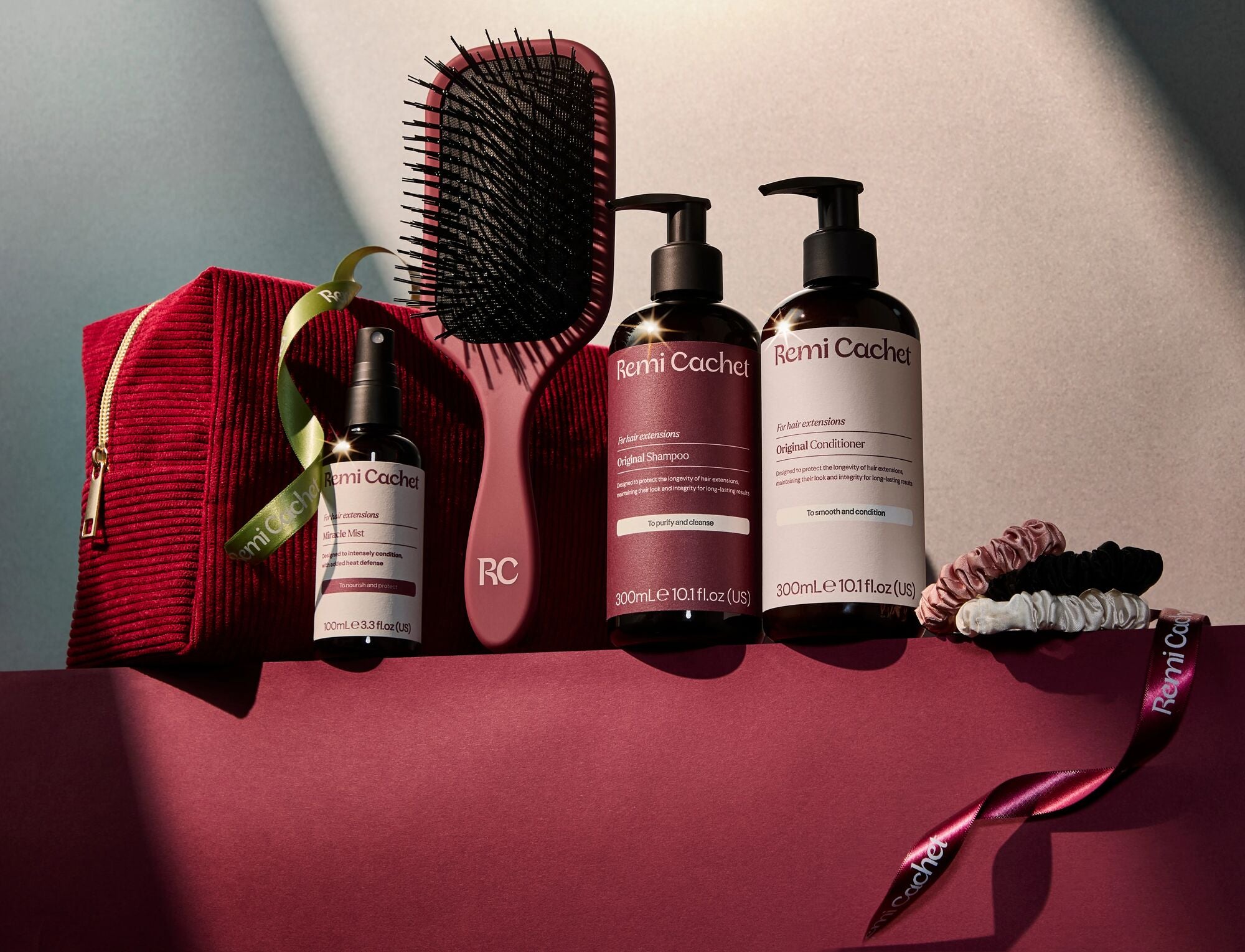 The Remi Cachet Signature Styling Gift Set is a retail ready collection of hair extension styling heroes. Featuring Remi Cachet Hairarchy Blow Dry Spray, Hair Oil, Blow Dry Brush, and an exclusive release Silk Scrunchie trio, this salon grade festive kit is designed for polished, versatile results, creating easy salon upsell opportunities and strong revenue potential this season.