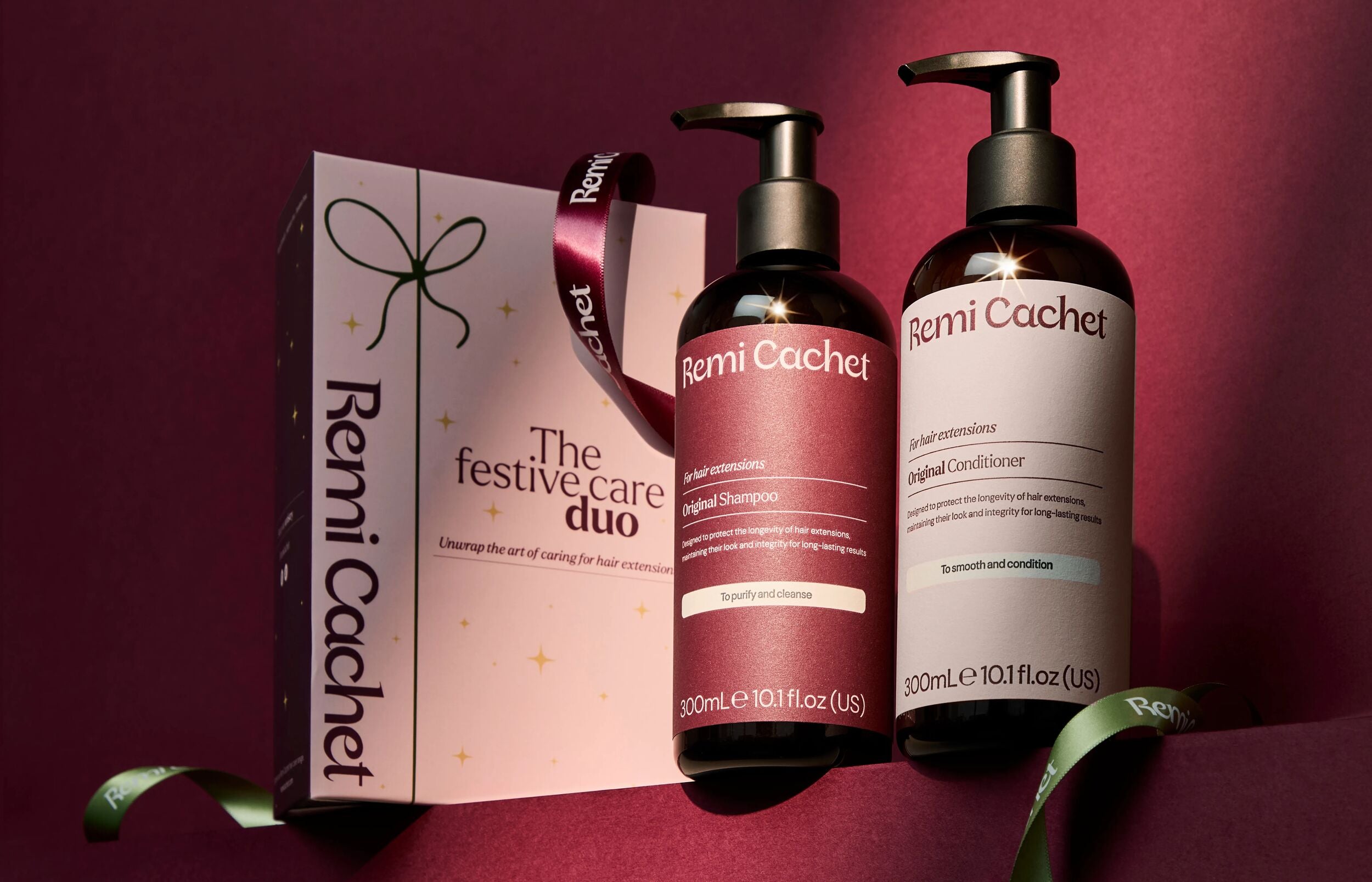 Offer your clients indulgence and extensions approved aftercare they’ll love. The Remi Cachet Nourishing Indulgence Gift Set includes Remi Cachet Shampoo & Conditioner, Miracle Mist, Paddle Brush, and an Silk Scrunchie trio. Drive salon retail margins, and dress your retail space for success during the festive period.